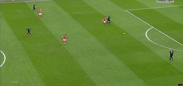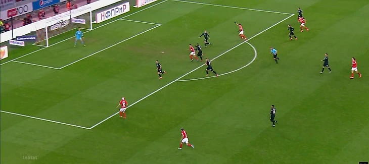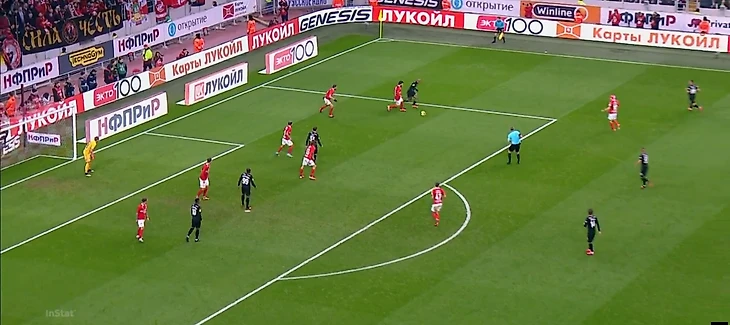 Рамирес, находясь в окружении трех игроков Спартака, делает передачу на Берга, которого не успевает закрыть Кутепов, швед смещается и бьет из-за штрафной по воротам