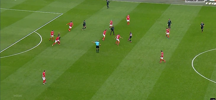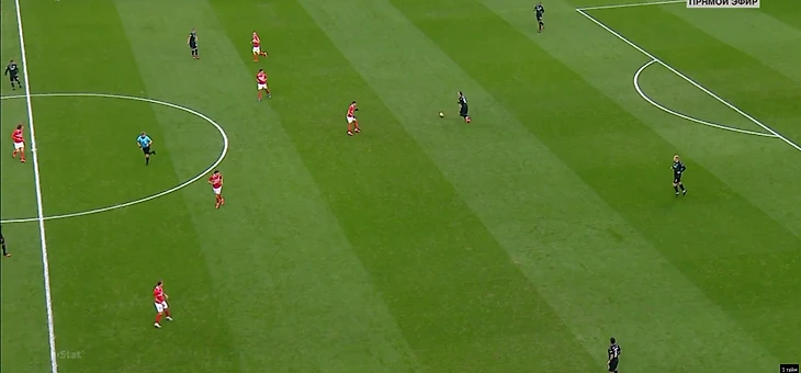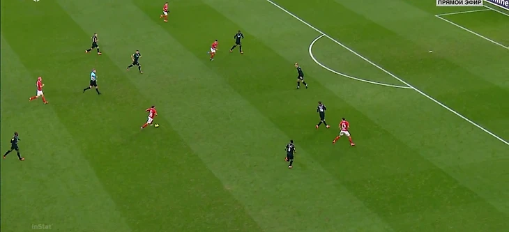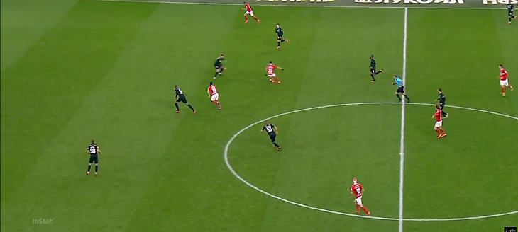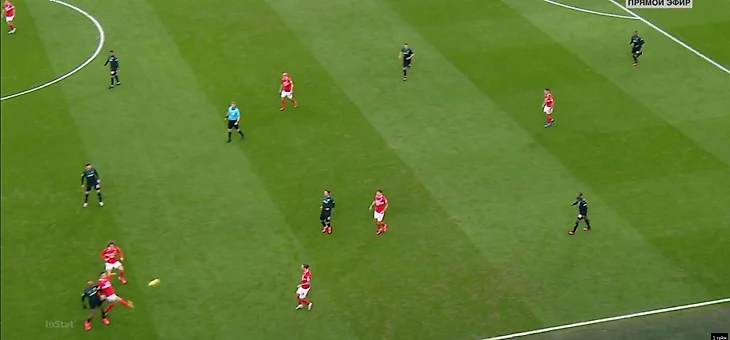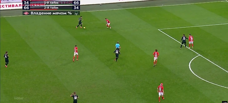 Примерно с 15-ой минуты Спартак перестал накрывать соперника прессингом на его половине и давал свободно катать мяч у ворот и переходить к более атакующим действиям. В такие моменты принято ругать команду, которая по идее должна пытаться доминировать и давить соперника весь матч, однако здесь расчет, скорее, оправдался, но подвела реализация.