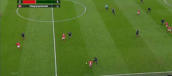 Бакаев получает мяч от Крала на краю штрафной и, не решаясь нанести удар, делает крайне невнятную передачу, потенциально голевой момент.
