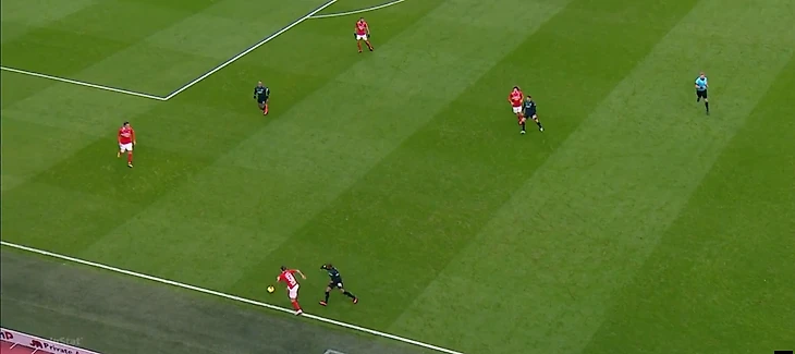 6-ая минута: прессинг быков, Кутепов вынужден переводить мяч на другой фланг