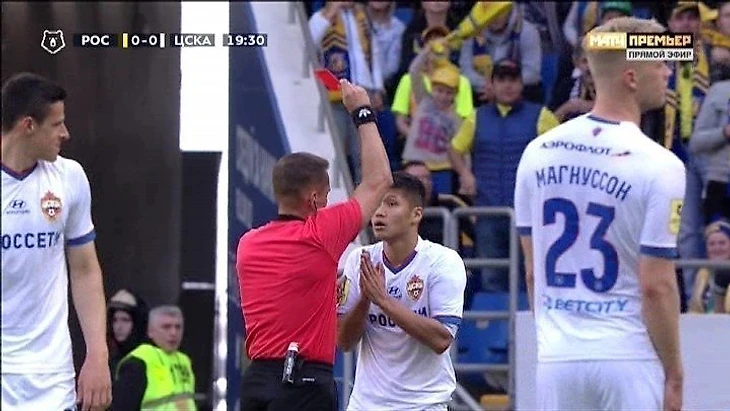 Матч "Ростова" и ЦСКА был отмечен не только эффектной драматургией, десятью желтыми карточками, тремя пенальти, но и двумя прямыми удалениями "армейцев". В случае с красной карточкой, показанной Ильзату Ахметову, вопросов нет. Полузащитник ЦСКА виноват сам: сначала проиграл позицию, затем борцовским приемом завалил Шомуродова в своей штрафной площади, лишив того явной возможности выйти один на один. Пенальти и удаление справедливы.
