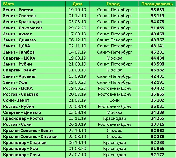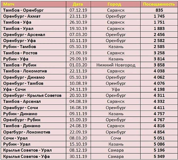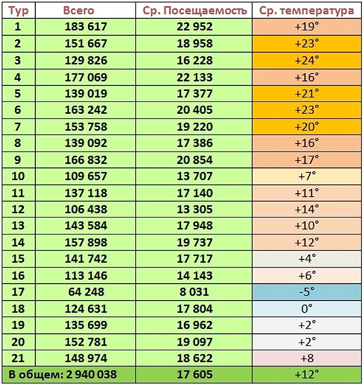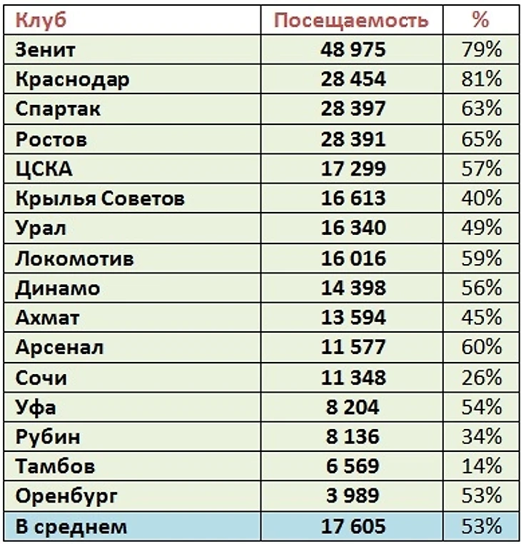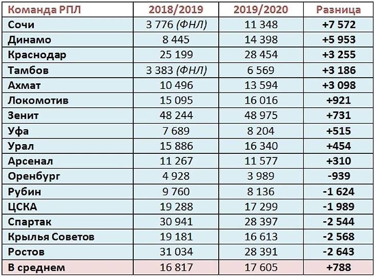 Средняя домашняя посещаемость клубов РПЛ, после 21 тура: