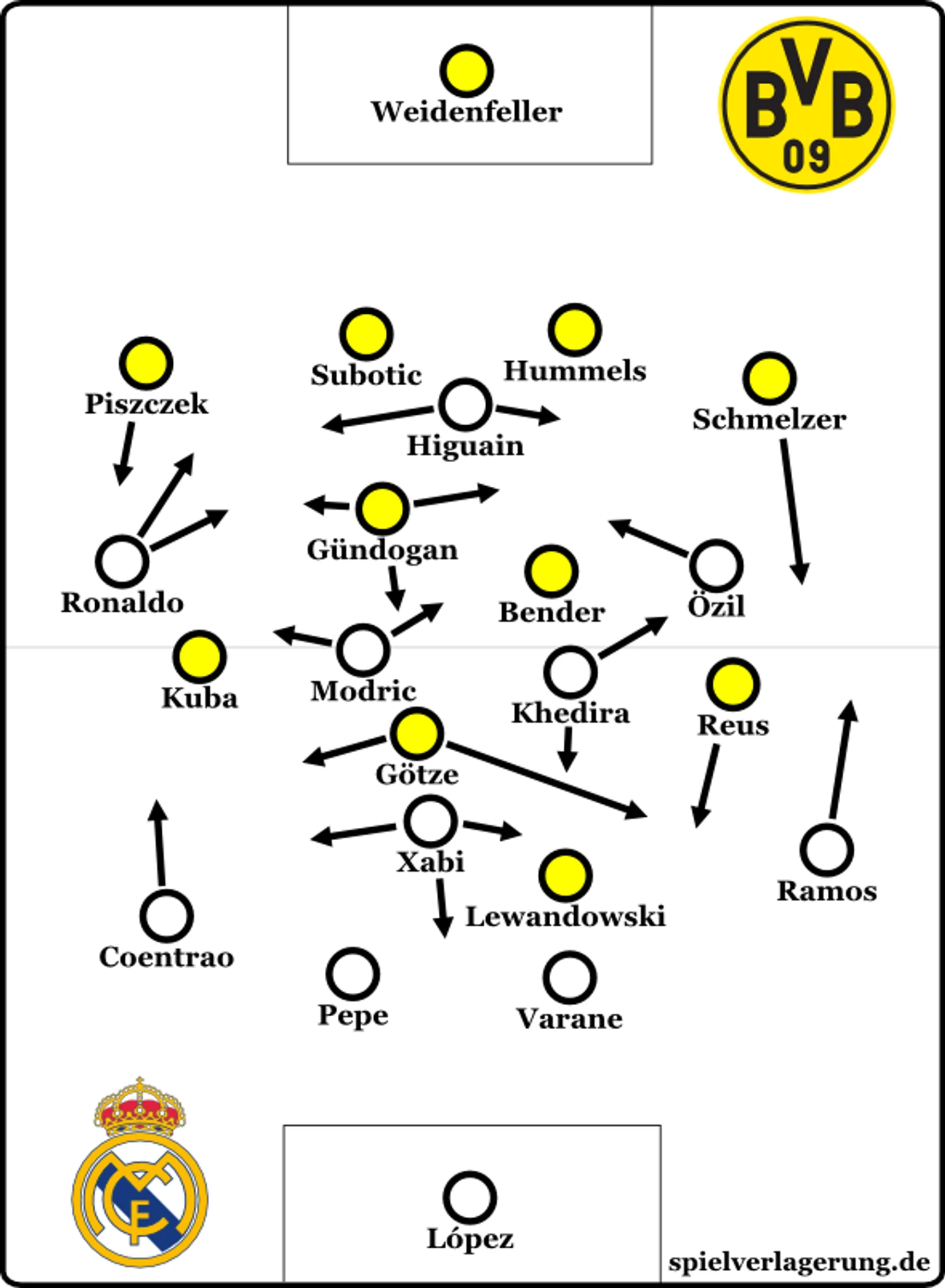 Первая игра проходила на «Сигнал Идуна Парк», поэтому дома «шмели» должны были сыграть максимально хорошо, ведь одолеть «Реал» на «Сантьяго Бернабеу» было очень тяжело. Клопп выставил привычную схему 4-2-3-1 без сюрпризов, а вот выбор Моуриньо удивил. Португальский специалист отказался от схемы 4-2-3-1 и выбрал 4-1-4-1. Из-за дисквалификации отсутствовал Арбелоа, поэтому на правый фланг переместился Рамос, а в центре защиты вышли Пепе и молодой Варан. Также Моуриньо предпочел Коентрау вместо Марсело, что наглядно показывало оборонительный настрой «королевского» клуба. Не было еще Ди Марии, Моуриньо на правый фланг поставил Озила, а в центре полузащиты вышли Алонсо, Модрич и Хедира. Хаби играл чуть ниже, почти в один ряд с центральными защитниками, чтобы создать численное преимущество и преодолеть высокий прессинг соперника. «Реал» вышел на «Сигнал Идуна Парк» обороняться, «сливочным» устраивала ничья.