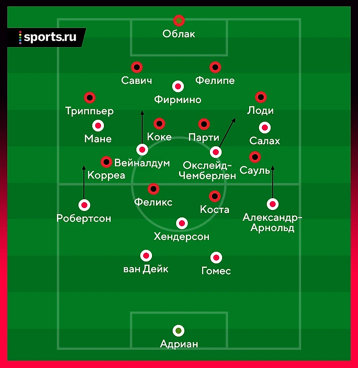 Сауль и Коке поменялись позициями. Изначально Сауль был на левом фланге, а Коке – в опорной. Примерно с 30-й минуты Коке ушел налево. Это не закрыло треугольник «Ливерпуля». Проблема была не в работоспособности отдельного игрока, а численном преимуществе и продуманных маневрах соперника.