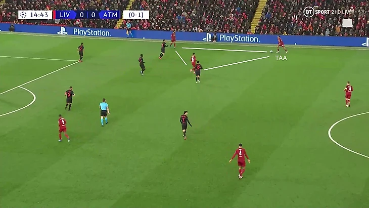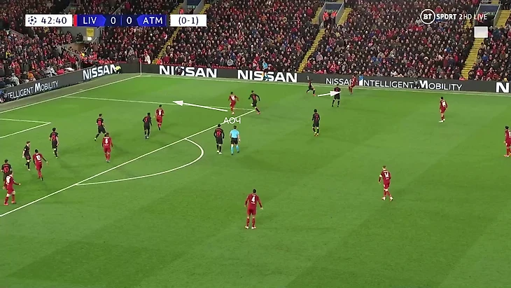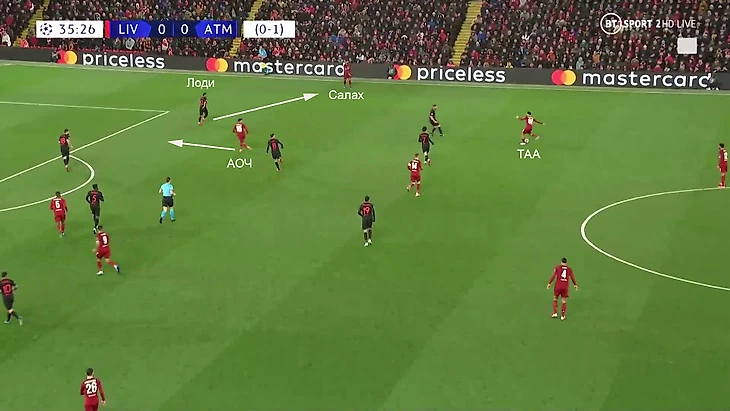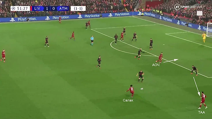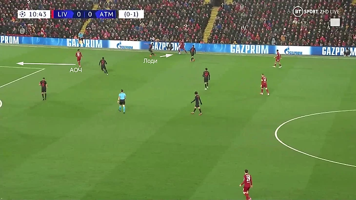 5. Второй прием – резкие рывки АОЧа на фланг. Если футболистам «Атлетико» удавалось одновременно прикрыть и Трента, и Салаха, это с высокой вероятностью означало, что Лоди в широкой позиции, а его привычная зона свободна. АОЧ всегда делал рывок в эту зону – часто партнеры награждали его пасом: