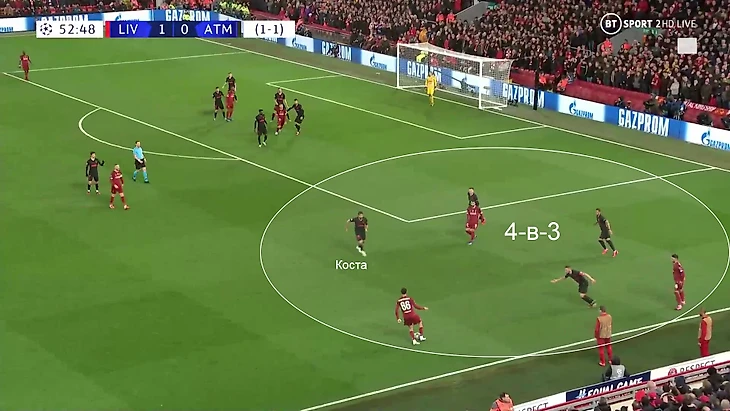 4. В первом матче «Атлетико» блестяще сдержал «Ливерпуль». Секрет успеха был в том, чтобы направить атаки команды Клоппа на фланги (это получалось у многих), а там контролировать их за счет детальной подготовки к сильным сторонам (это не получается почти ни у кого). К домашней встрече Симеоне великолепно изучил классическую фланговую игру соперника – и разбил ее.