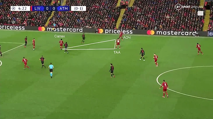 Там действовал треугольник ТАА-АОЧ-Салах. В первой игре «Атлетико» контролировал этот фланг, потому что ширину создавал Трент – Салах почти весь матч играл дополнительного форварда (его просто передавали Фелипе). Сейчас ширину создавали разные игроки, включая Салаха (его роль сильно изменилась) – иногда сразу два футболиста. «Атлетико» приходилось растягиваться и адаптироваться.
