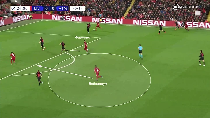 Обратите внимание и на Фирмино. Он регулярно пытался уводить другого опорника, а не играл против центральных защитников в такие моменты (что тоже помогало Вейналдуму).