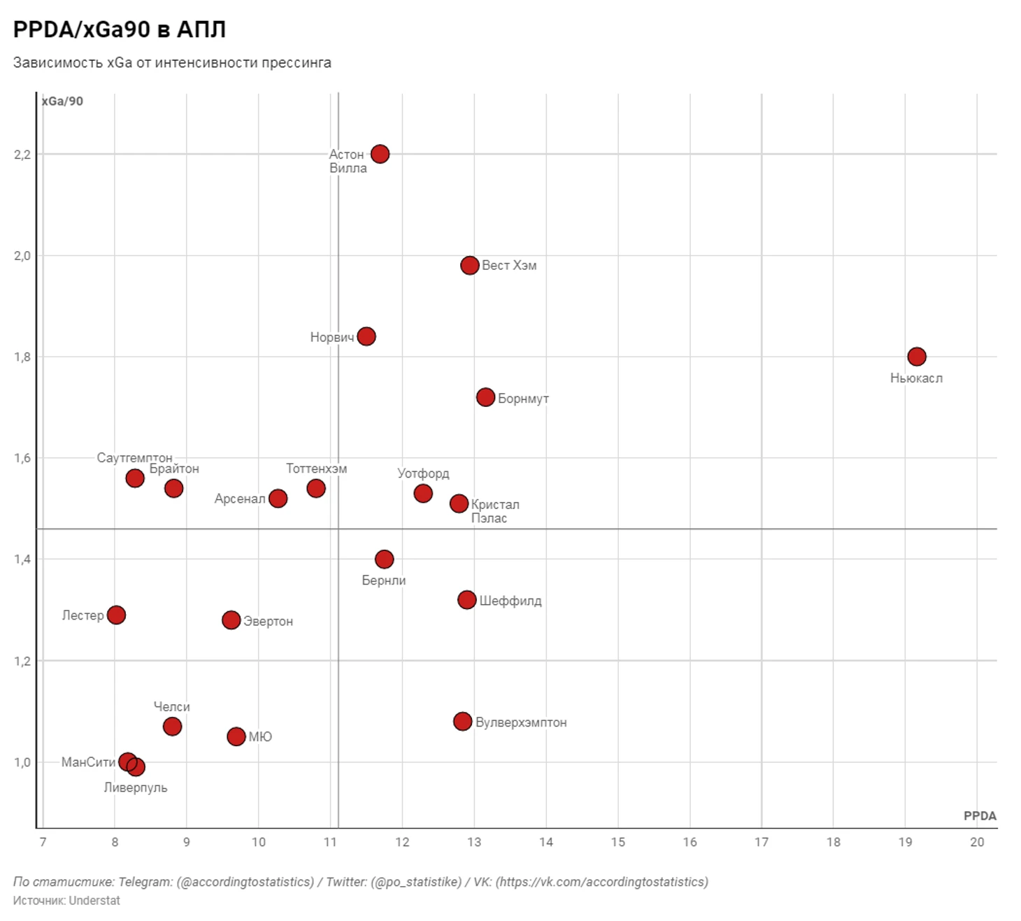 Показательно, что остальные 4 лучшие по PPDA команды набрали по xGa90 чуть больше среднего по лиге показателя, что говорит о взаимосвязи интенсивного прессинга и качества допущенных моментов у своих ворот в АПЛ.