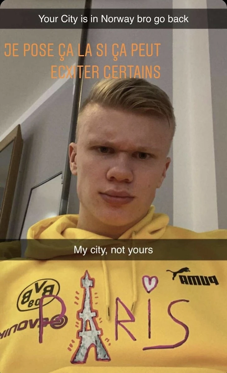Похоже, игроки «ПСЖ» купились на фейк. Незадолго до игры в интернете стали распространять скриншот якобы с аккаунта Холанда в снэпчате, где была его фотография с подписью «Париж – это мой город, а не ваш». Но официального аккаунта норвежца в снэпчате нет – вполне вероятно, что на него наложили надписи и пустили в соцсети.