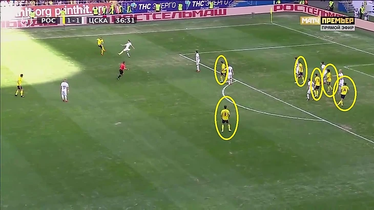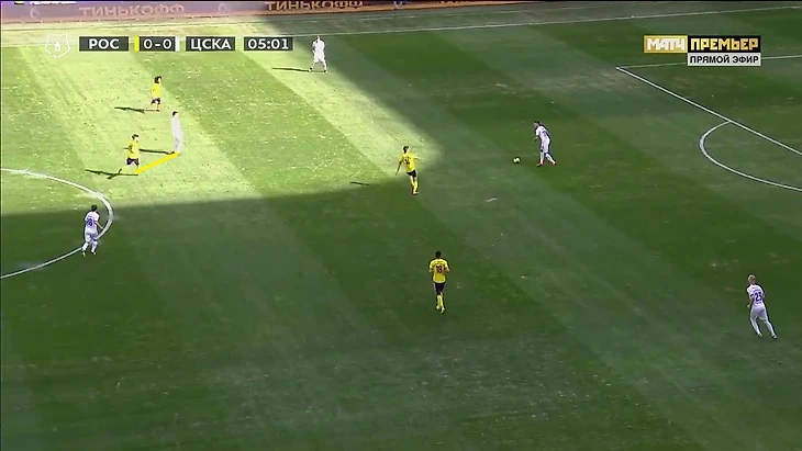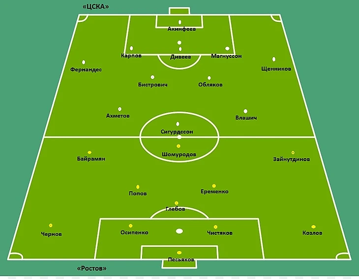 Хозяева завладели мячом с первых минут, «Цска» этому не противился. Ростовчане расположились в привычных 4-3-3, в первые минуты старались много использовать крайних защитников при продвижении. Центральные защитники также активно участвовали в начале атаки, особенно Осипенко, который делал рывки с мячом на чужую половину. Через центр атаковать приходилось проблематично, Влашич играл персонально по Глебову, а опорник гостей не стремился сбрасывать с себя опеку хорвата. Но уже на 13 минуте Карпину пришлось совершить вынужденные перестановки – вместо Чистякова вышел Саплинов и отправился на позицию Байрамяна слева в нападении, Хорен занял место правого защитника, а Козлов перешёл в центр защиты. После изменений нужно было время для того чтобы сыграться, да и в продвижении атаки «Ростов» немного потерял, ведь Козлов на позиции центрального защитника исполнял скорее вспомогательную роль в начальной стадии позиционки. Все это накладывалось на отличный оборонительный план «армейцев». Без мяча гости предложили 5-3-2 с Сигурдссоном и Влашичем выше. Если роль Николы я уже упомянул, то исландец напрягал центральных защитников, но не слишком активно, позволяя тому же Осипенко заходить на половину соперника с мячом. Ахметов, Бистрович и Обляков составляли узкую тройку полузащитников в центре и располагались компактно, а при получении мяча крайними защитниками хозяев на них выбрасывались латерали. «Цска»удалось ограничить атакующий потенциал «Ростова» до удаления.