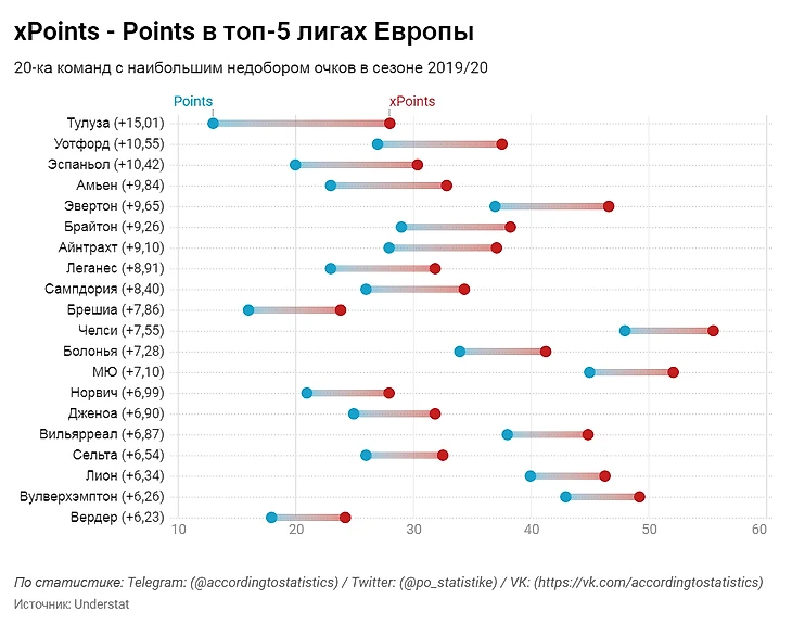 Команды топ-5 лиг Европы, имеющие наибольший недобор очков согласно модели xPoints