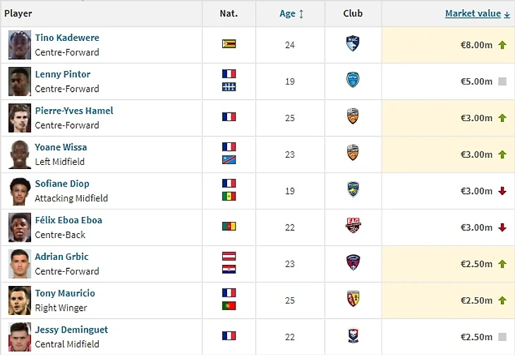 Ниже представлены самые дорогие игроки второго дивизиона Франции (Лиги 2). Ожидаемо, возглавляет рейтинг главный голеадор турнира — Тино Кадевере, который уже летом присоединится к «Лиону».
