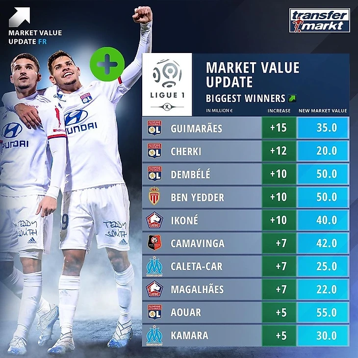 Несмотря на то, что в ПСЖ практически нет изменений, рыночная стоимость 17-летнего защитника Танги Куасси выросла с 7 до 12 миллионов евро. Также некоторые игроки, занимающего второе место «Марселя», получили повышение, в том числе Дюже Чалета-Цар (+7 млн евро) и Бубакар Камара (+5 млн евро).