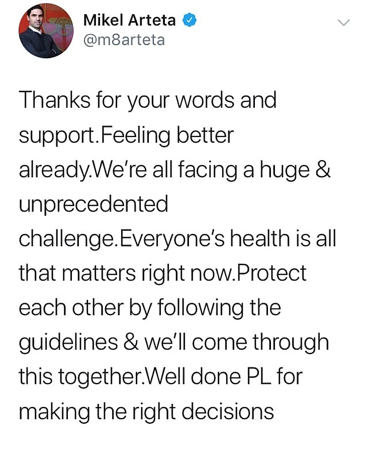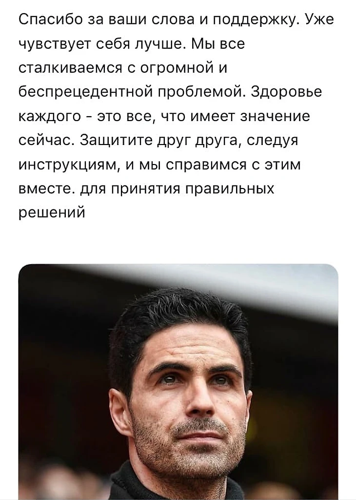 Вчера вечером, Артета выложил заявление в своем твиттере, что всё хорошо