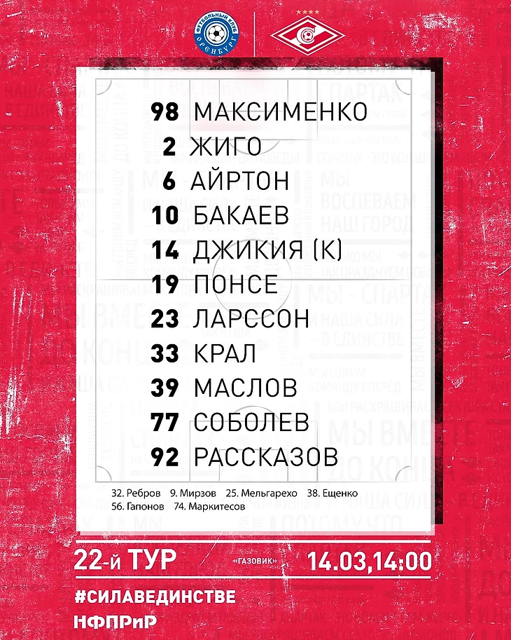 Состав «Спартака» в матче с «Оренбургом»