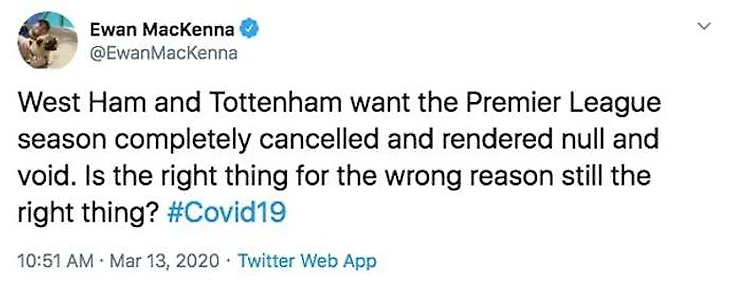 Все выглядит логично: «Тоттенхэм» проводит ужасный сезон и может пролететь мимо еврокубков. У «Вест Хэма» все еще хуже, команда над зоной вылета, а после 17 мая им будет негде играть. Косвенно эту информацию подтвердила вице-президент «ВХЮ» Каррен Брэйди в колонке для The Sun: она посочувствовала «Ливерпулю», но сказала, что сезон нужно отменять.