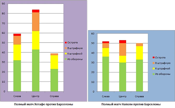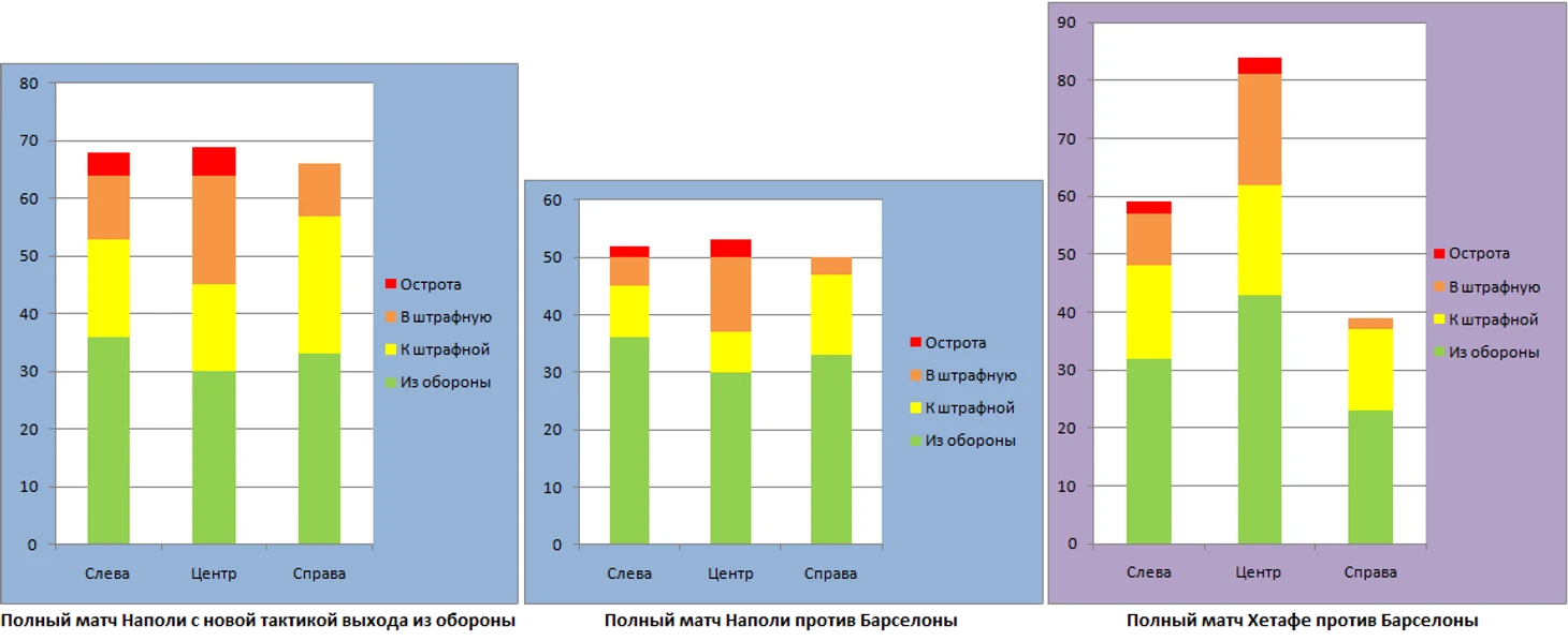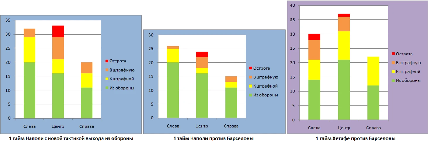 Круговые диаграммы структуры игры «Барселоны» против «Хетафе» и «Наполи» показывают, что в первом случае она очень много тратила времени на выход из обороны и мало на атаки, но зато создала в итоге в избытке острых моментов. Тогда как с «Наполи», она легко выходила и много катала мяч в нападении, часто пыталась проникнуть в штрафную и даже успешно, но почти ничего при этом не создала. То есть, как оборонительная система, тактика «Наполи» эффективнее тактики «Хетафе», а как атакующая, наоборот, значительно хуже. Наша цель придумать систему, сочетающую в себе силу обороны «Наполи» и атаки «Хетафе».