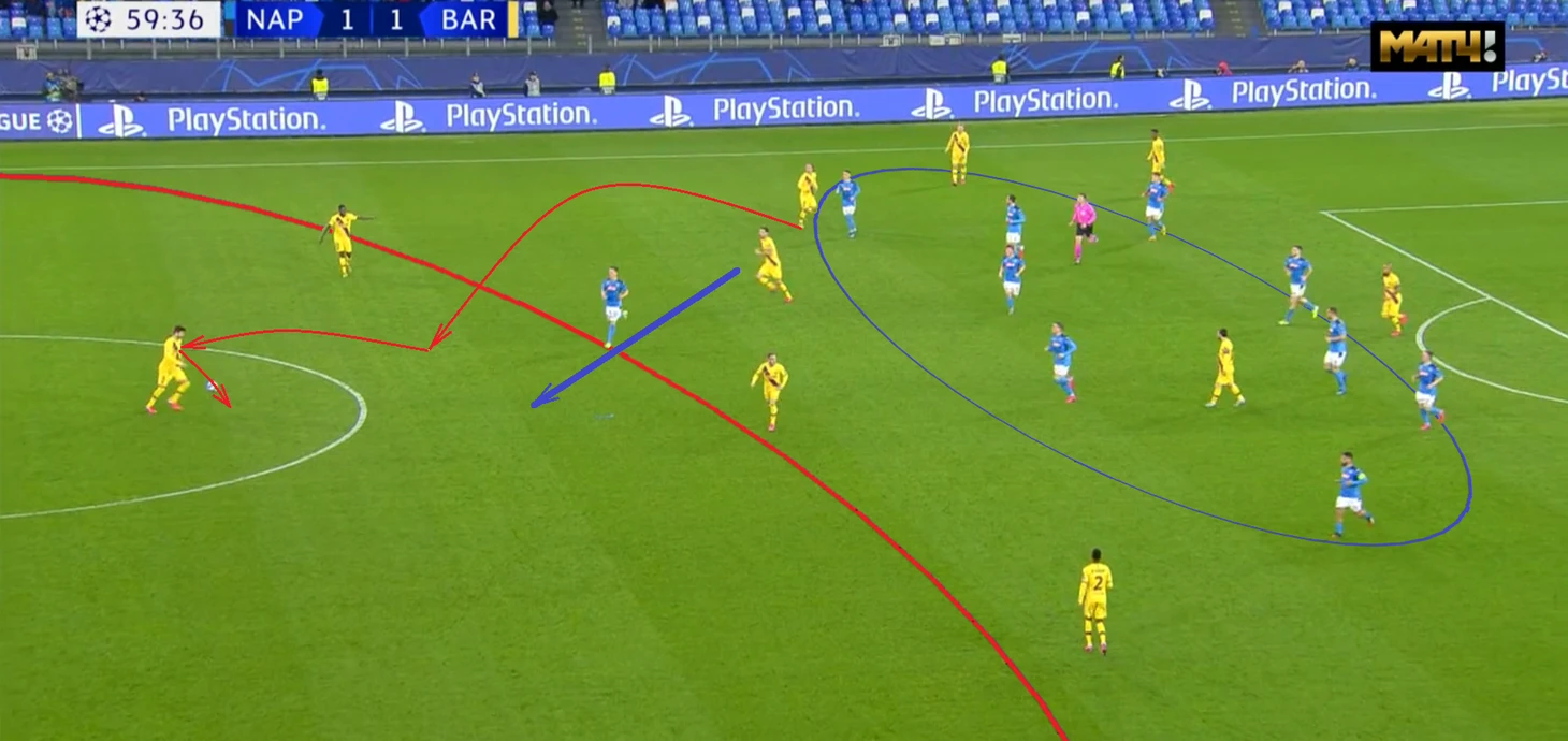 «Наполи» (в бело-голубом) располагается очень узко и глубоко, «Барселона» (в жёлтом) его обволакивает со всех сторон, за их спинами обширное пустое пространство, где находятся только Пике и Умтити. Гризманн под давлением выбрасывает мяч назад в точку, находящуюся в 8 м от Пике, мяч отскакивает от газона, неудобно прилетает Пике в грудь, тот обрабатывает его так, что мяч отлетает ещё на 1.5 м в сторону. Игрок «Наполи» обозначает прессинг, выдвигаясь в сторону Жерара, но у него нет ни одного шанса вступить в отбор – слишком далеко.