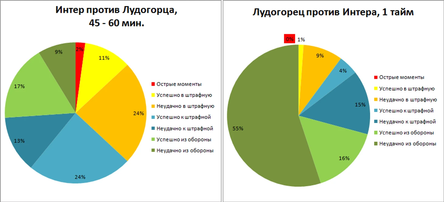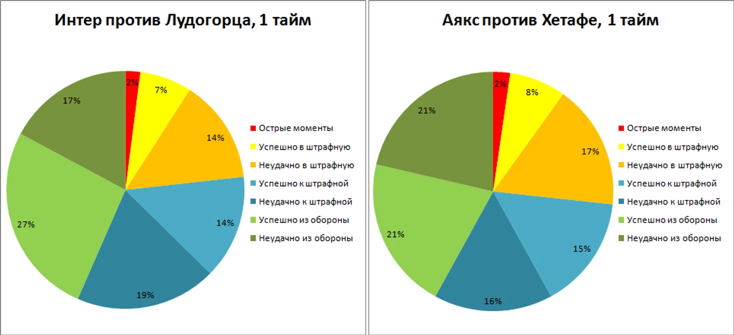 Например, «Интер» Конте совсем не считается комбинационно атакующей командой, наоборот, он предпочитает игру на контратаках, но в матчах с аутсайдерами вынужден сам контролировать мяч и играть в позиционное нападение. Так, в матче против «Лудогорца», его показатели распределения игрового времени по стадиям атаки практически не отличимы от показателей «Аякса», считающегося командой любящей много контролировать мяч, да ещё и в матче, в котором ему нужно было отыгрываться.