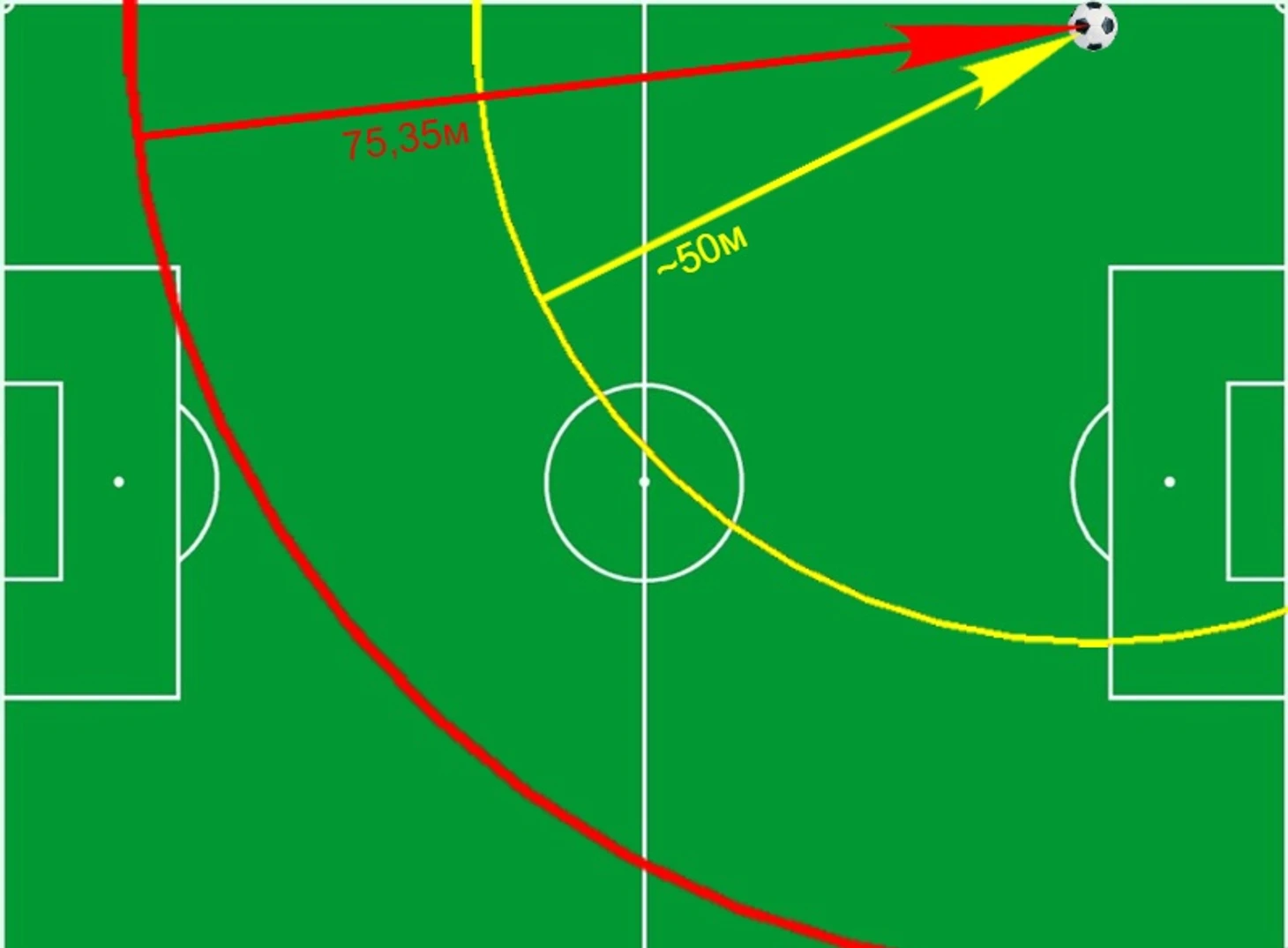 Время от выноса мяча игроком «Наполи» до вброса его обратно в игру, из предыдущего примера, составило 13 секунд, что очень много. Обычно, на такой аут хватает 7 – 9 секунд, из которых 3 - 4 секунды мяч летит за пределы поля. На схеме обозначены дистанции, с которых за 7 секунд должны успевать добежать до точки вброса люди по разным спортивным нормативам: жёлтый цвет (50. 72 м) – отличник 9 – 11 класс; оранжевый цвет (65.4 м) – КМС; красный цвет (73.07 м) – рекорд на 100 метров Усэйна Болта 16.08.2009 года; синий цвет (57.36 м) – Лионель Месси в Эль-Класико с мадридским «Реалом».