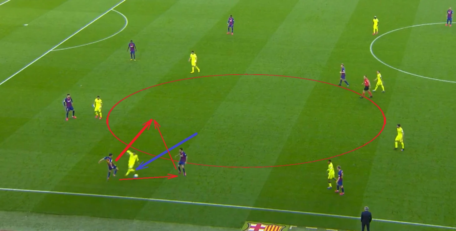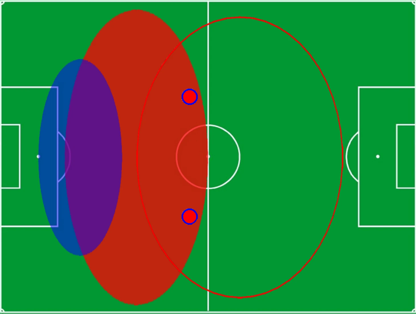 Первая цель условной «Барселоны» привести расположение своих игроков и игроков соперника в нужную конфигурацию, а именно: команда соперника должна вжаться в штрафную, а «Барселона» обступает её и пытается найти путь мячу в ворота. Если соперник неуступчивый или неопытный, всё начинается на своей половине и в середине поля, где много места и легко контролировать мяч, имея хороший подбор футболистов. Игроки команд рассредоточены, построения растянуты, зона их пересечения на схеме обширна. «Барселона» (красный цвет на схеме) катает мяч в кругах, квадратах, треугольниках и ромбах, а игроки условного «Наполи» (синий цвет на схеме) бешено носятся, пытаясь его перехватить. Но самая банальная и очевидная правда в том, что мяч передвигается по полю гораздо быстрее любого игрока, а активно прессинговать непрерывно невозможно. Поэтому в какой-то момент «Наполи» выдыхается и отказывается от прессинга. Высоко обороняться без активного прессинга нельзя и команда опускается к своей штрафной в более узкую экономичную оборону. Всё это время «Барселона» может не проводить ни одной атаки и вообще не задумываться о чужих воротах, на этом этапе у неё другая цель и теперь она достигнута.