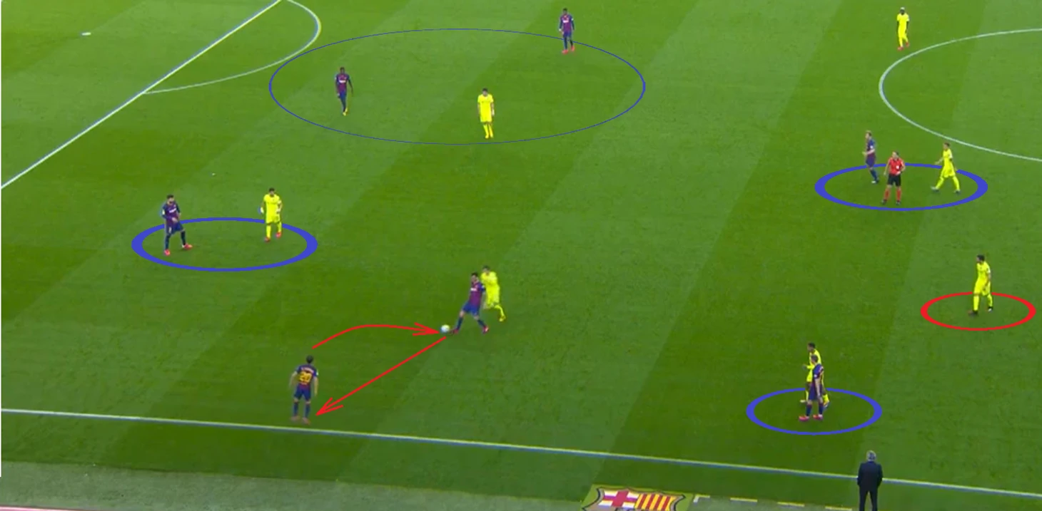 «Хетафе» (в жёлтом) пренебрегает использованием «лишнего» игрока, прессингуя при ауте один в одного, что приводит к численному перевесу игроков «Барселоны» (в сине-гранатовом), которые вбрасывают мяч по удобной траектории, а затем, играя в стеночку, легко обходят единственного игрока «Хетафе», вскрывая большую зону за его спиной. В результате, тормозить эту атаку хетафеньо пришлось при помощи фола.