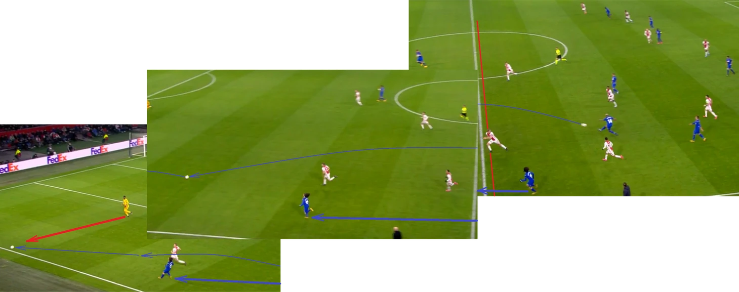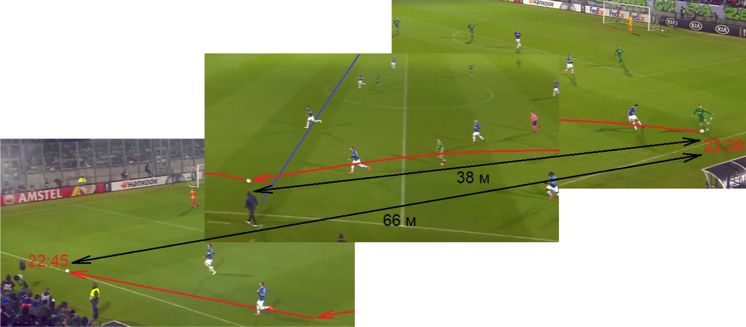 Пример выноса в аут по диагонали на 55 м в матче «Аякс» - «Хетафе». У игрока было пространство и он смог хорошо разбежаться, чтобы отправить мяч на такую дистанцию.