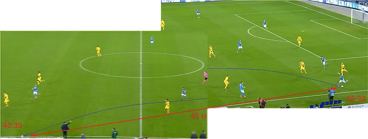 Пример выноса игроком «Наполи» мяча на 45 м хорошим ударом от своей штрафной. У него было пространство и время, однако, точка выхода мяча всё равно оказалась слишком близко к центральной линии.