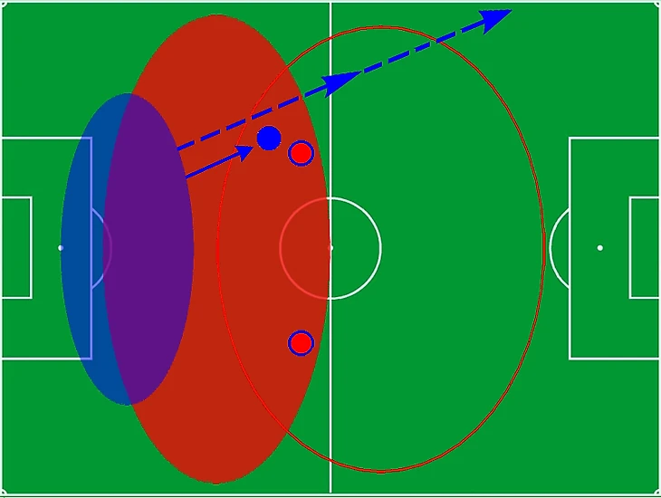 У чужой штрафной плотность уже больше, площадь пересечения сильно сокращается, контролировать мяч сложнее. Временами просто невозможно его контролировать за счёт одного мастерства игроков будь у тебя хоть десять Месси на поле и тер Штеген в воротах или по пять Хави и пять Иньест на поле и неизменный тен Штеген в воротах. Единственным средством сохранить мяч в этой ситуации становится глубина обороны соперника, создающая огромные пустые зоны за спинами атакующих. Именно выброс мяча из-под прессинга в эти пустые зоны и позволяет сохранить контроль. В этих зонах располагается пара центральных защитников, которым можно отдавать пас любой неточности и сложности: они слишком далеко, как от своей штрафной, так и от игроков соперника, поэтому страх ошибки их не беспокоит ни спереди, ни сзади. Им можно отдавать пасы с люфтом точности в 5 - 10 метров, в горло, живот и вообще как угодно. Они могут обрабатывать эти пасы сколь угодно долго, с любыми техническими погрешностями – всё равно никто из соперников не успеет до них добежать и вступить в отбор во время приёма мяча.