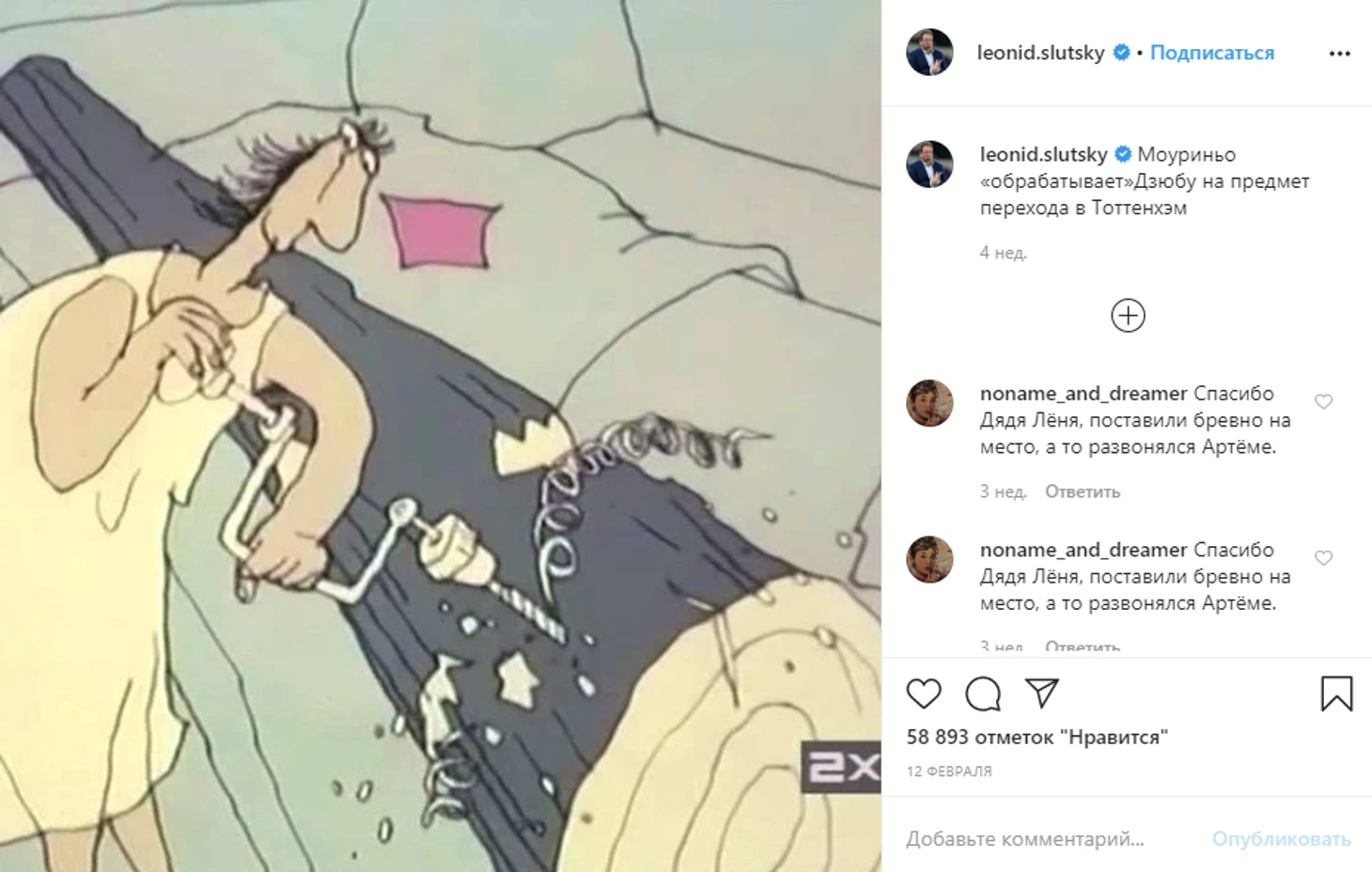 Может Лео и Дзю не могут радовать публику футбольным путем, они веселят людей регулярно устраивая перепалки в Инстаграме. Как правило, раз в месяц Слуцкий обязательно постарается высмеять «деревянность» футболиста, а Артемий посчитает своим долгом пошутить над лишним весом коуча.
