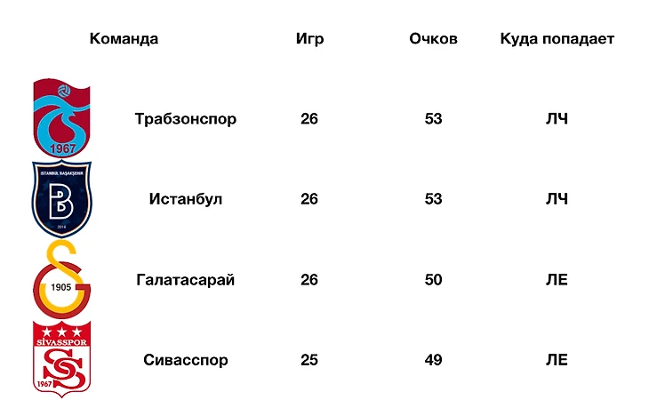 На данный момент лидерство делят две команды: «Трабзонспор» и «Истанбул Башакшехир». У обеих команд по 53 очка и до конца чемпионата осталось 8 игр. В минувшее воскресенье они встретились между собой, но победителя не выявили – 1:1 и паритет на первом месте сохраняется. Конкуренты близко – «Галатасарай» и «Сивасспор» отстают от лидеров лишь на 3 очка.