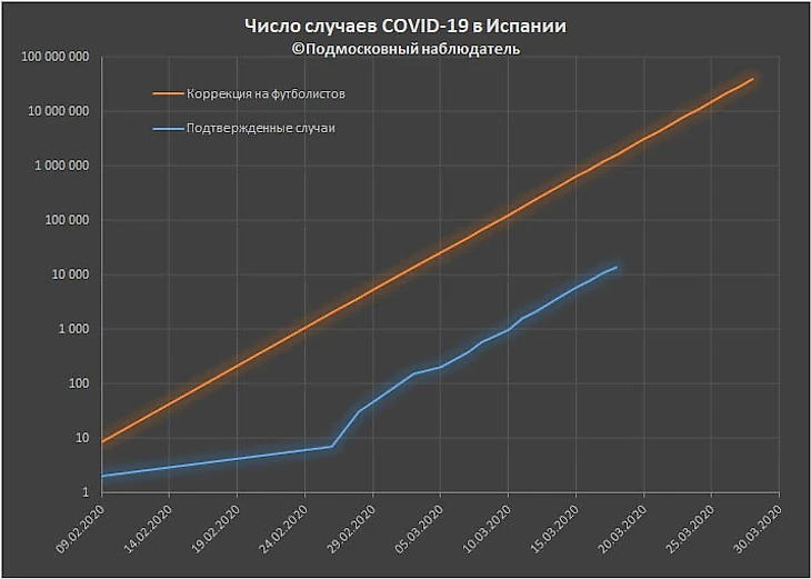 Если гипотеза о репрезентативности футболистов всему населению страны верна, то на 18 марта возможно заражение COVID-19 более полутора миллиона испанцев.