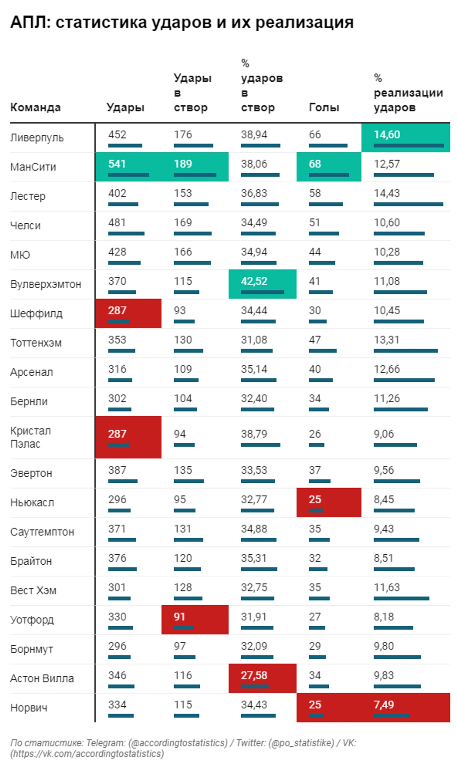 По реализации ударов лучшим стал "Ливерпуль" (14,60%), а худшим - "Норвич" (7,49%).