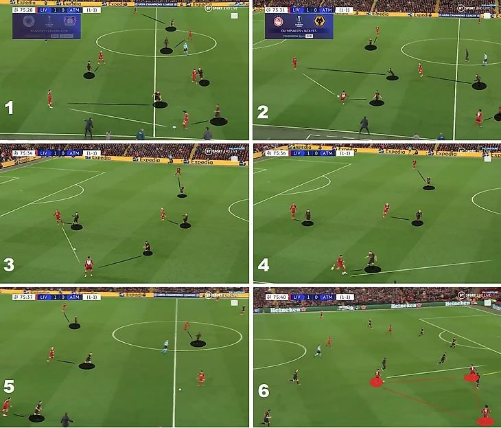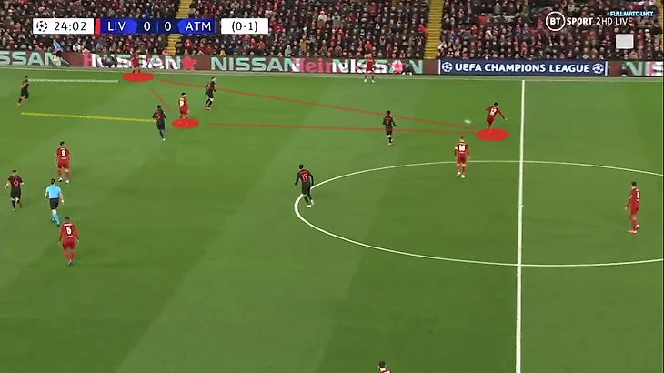 Окс занимал нужную позицию между Трентом и Салахом, при этом не засиживаясь в центре. Против «Атлетико» игроки «Ливерпуля» довели задуманное расположение практически до идеала, покрывая как можно большую площадь поля. Увеличенные расстояния между игроками «Ливерпуля» заставляли игроков «Атлетико» преодолевать большую дистанцию, чтобы закрыть опасную зону или начать прессинговать. Это отнимало много сил, времени и открывало зоны за их спинами.