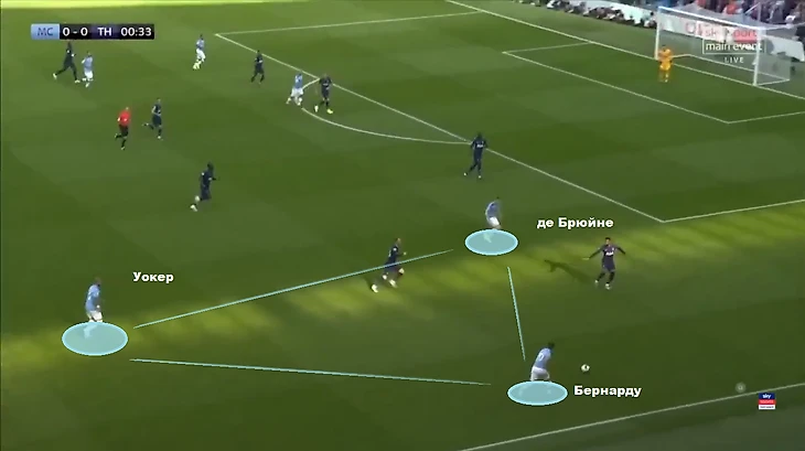Данное построение позволяет растянуть оборону соперника и максимально задействовать разрывы между защитниками. Вингеры создают ширину, полузащитники врываются в полуфланги и стремятся сделать прострел. Уокер отдает мяч Бернарду, португалец делает передачу на Де Брюйне в полуфланг. Ничего не напоминает?
