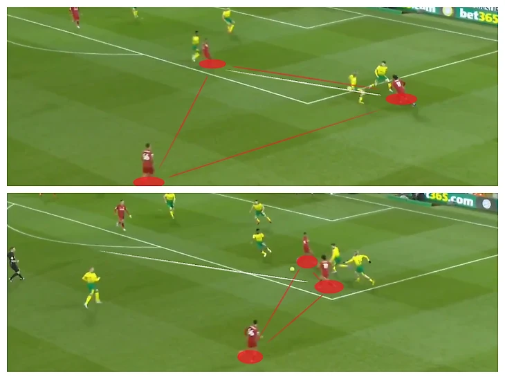 «Ливерпуль» до недавнего времени использовал полуфланг как своеобразный «полустанок» для дальнейшего продвижения мяча. Например, через смещение вингера. В этом моменте Салах принимает мяч на фланге, начинает смещение в центр и отдает мяч в полуфланг на набегающего Вейналдума. Голландец в касание возвращает мяч египтянину, тот делает пас вдоль штрафной на Окса: