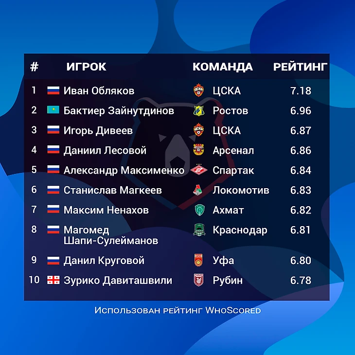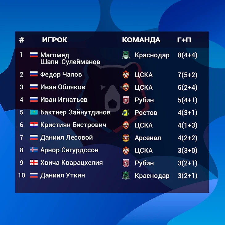 Шапи и Чалов - в огне. Нападающий «Краснодара» набрал 8 очков по «гол+пас»: На его счету 4 гола и 4 передачи. У Чалова - 7 (5+2). У их преследователей Ивана Облякова и Ивана Игнатьева из «Рубина» по 6 (2+4) и 5 (4+1), соответственно. Сразу 3 игрока настреляли 4 очка : Бахтиёр Зайнутдинов (3+1), Кристиян Бистрович (1+3), и Даниил Лесовой (2+2).