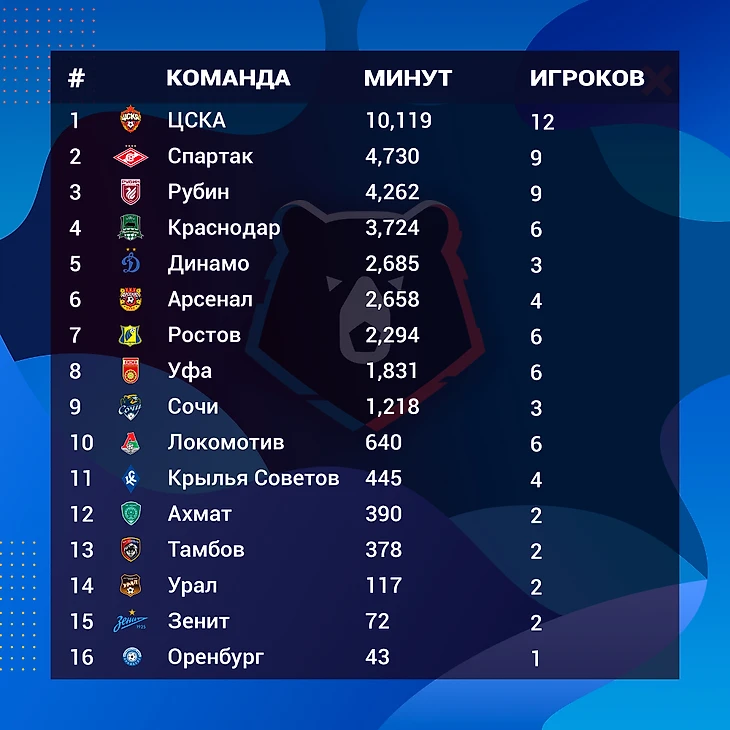 «ЦСКА» - Абсолютный лидер. Ожидаемо, «ЦСКА» подтверждает статус самой молодой команды чемпионата своей статистикой. Суммарно 12 игроков «армейцев» набрали больше 10 тысяч минут, что в два раза больше результата ближайшего преследователя. Чалов, Обляков и Дивеев - одни из лидеров среди полевых по набранному игровому времени.