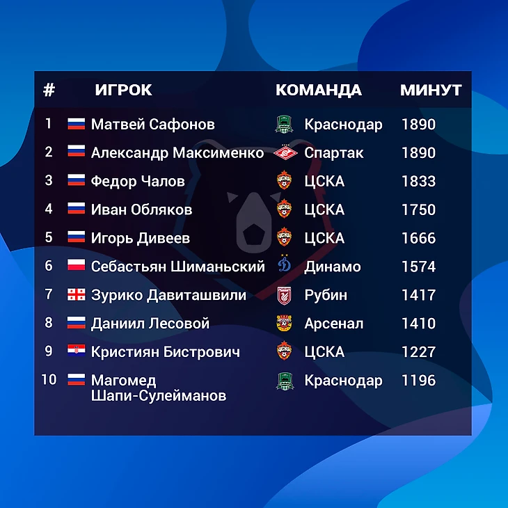 Больше всего игрового времени получили Максименко и Сафонов из «Краснодара» - по 1890 минут. Следом идут Чалов (1833 минуты), Обляков (1750) и Дивеев (1666).