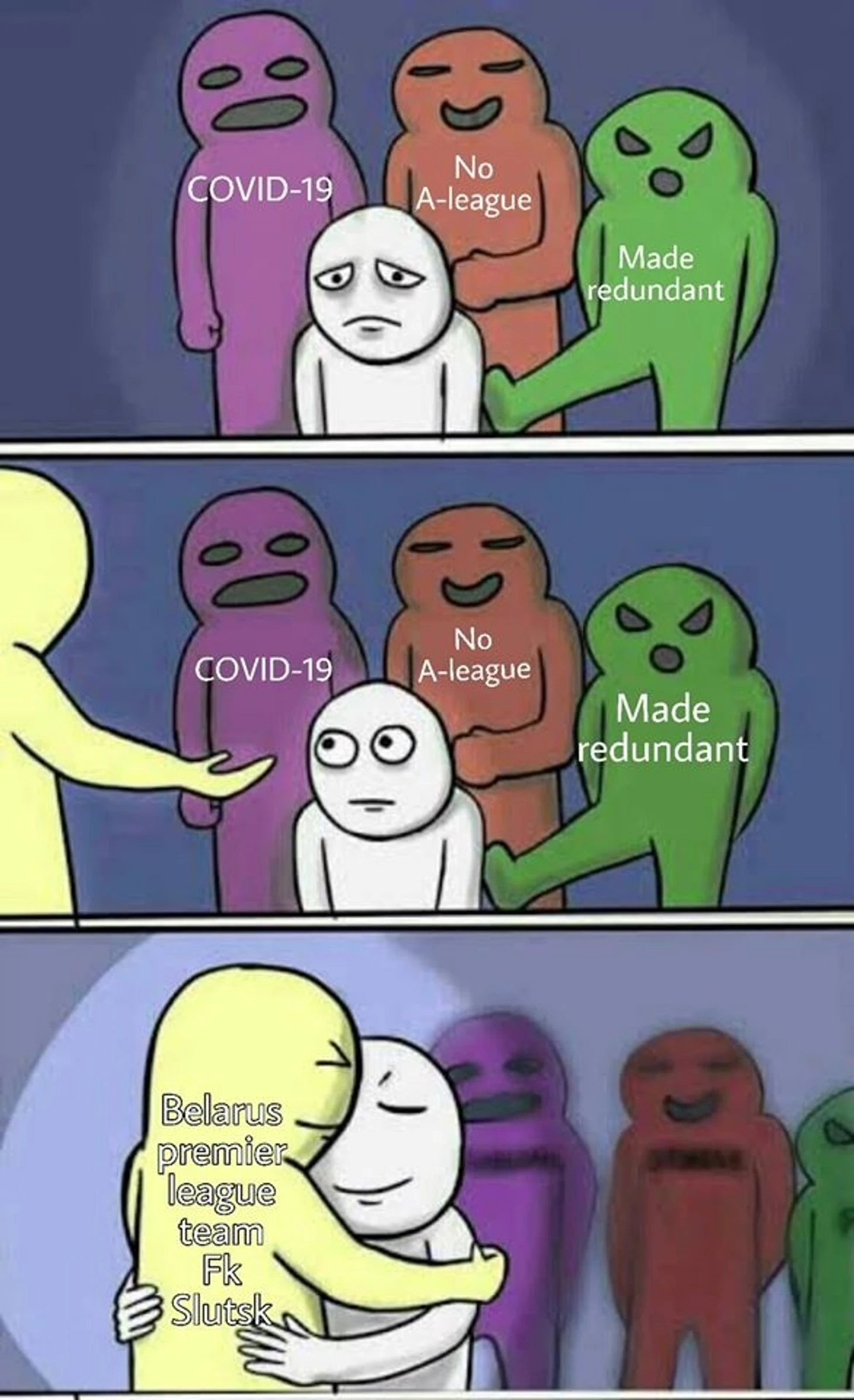 Для нынешнего странного времени это вполне типичный сценарий. Австралийская А-Лига долго держалась, но в итоге сдалась 23 марта, уйдя в паузу на месяц. Чемпионат Беларуси же идет без остановок и тем самым дает болельщикам из других стран серьезный повод познакомиться с местными командами. Австралийцам весело поддерживать «Слуцк» из-за созвучия названия с английским «slut» («шлюха»). Группу доверху засыпало мемами. Их можно посмотреть здесь, а тут пусть будет такой – о значении «Слуцка» в жизни новых фанатов: