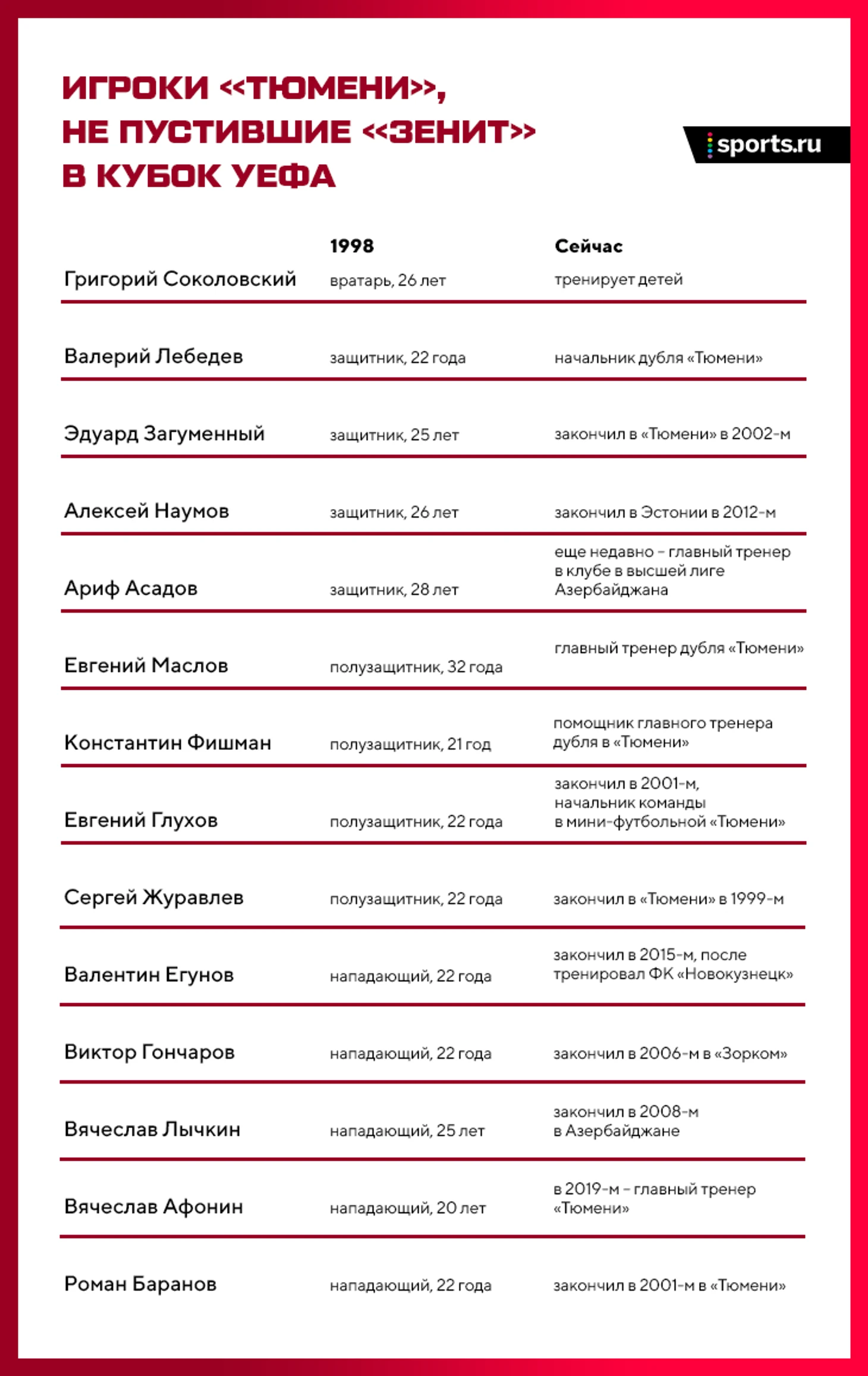 «Тюмень» вылетела очень достойно, а «Зенит» остался без Кубка УЕФА. Правда, как выяснилось позже, 4-е место все равно не позволило бы попасть в еврокубки – УЕФА чуть переформатировал турнир. А «Зенит» в итоге прорвался туда через Кубок России – тот самый матч с «Динамо», где забивал Панов.