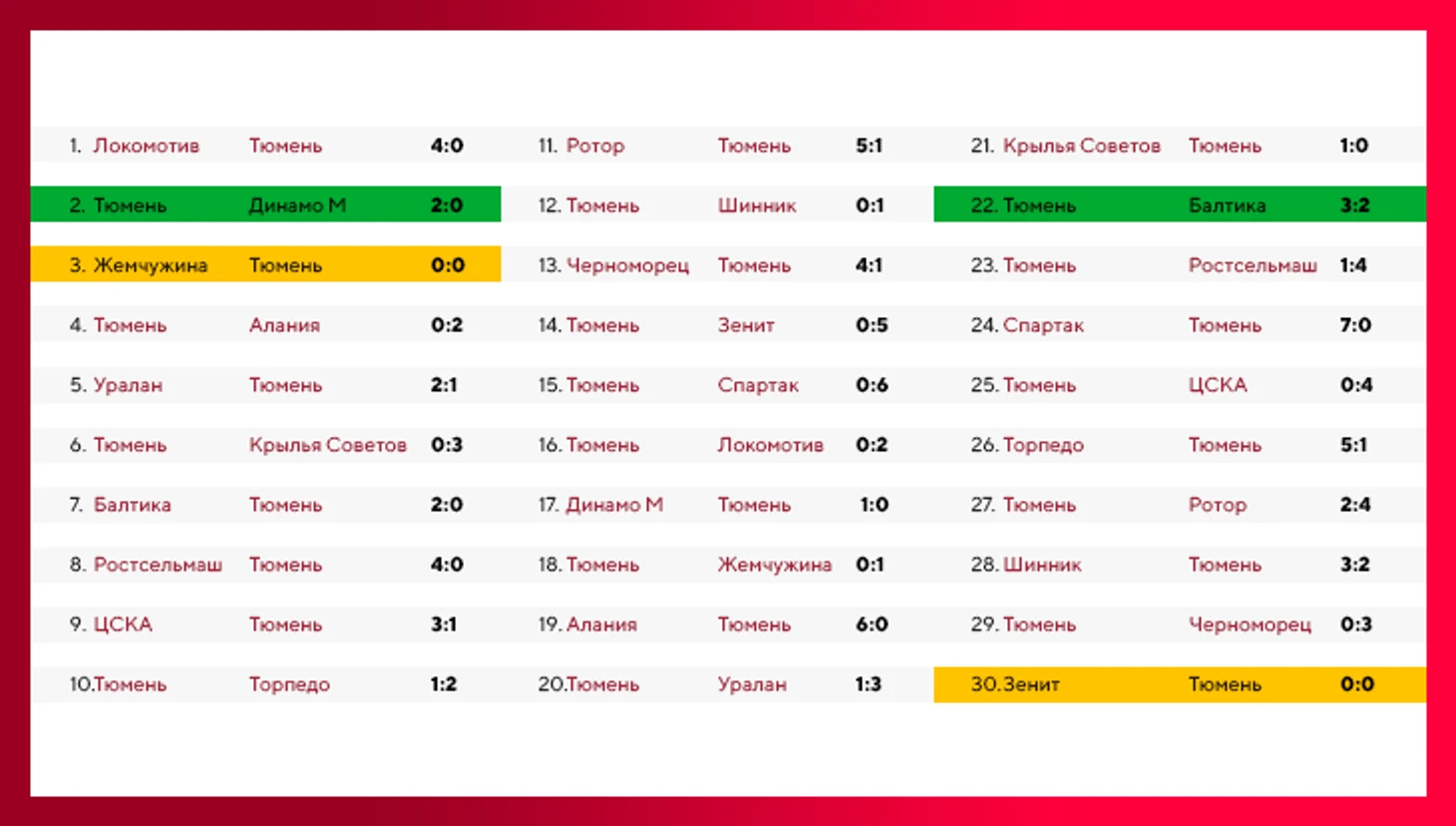 С футболом в Тюмени не сложилось исторически: лучшие результаты – 11-е место в первой лиге СССР и 12-е – в вышке чемпионата России-1994. В 90-е клуб скакал между высшей и первой лигой, а в 1998-м сотворил уникальное: за 30 матчей в премьер-лиге набрали всего 8 очков, выдали серию из 18 поражений подряд и пропустили 89 голов.
