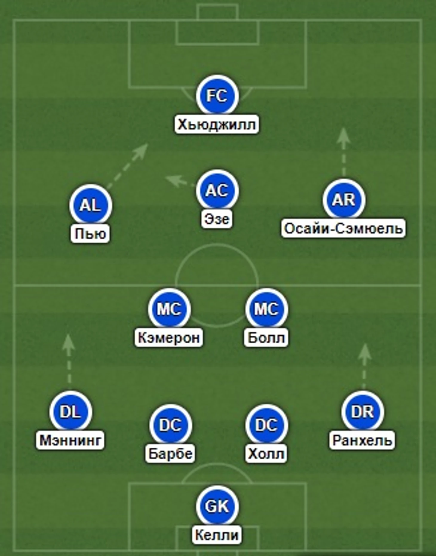Латерали часто подключаются к атакам для выполнения навесов, Эзе играет роль свободного художника, чаще всего смещаясь влево и обратно в центр, Пью освобождает место, чаще всего уходя чуть глубже под Хьюджилла, а Брайт Осайи-Сэмюель бегает по флангу, обводит, вбегает в штрафную и простреливает, изредка смещаясь ближе к центру