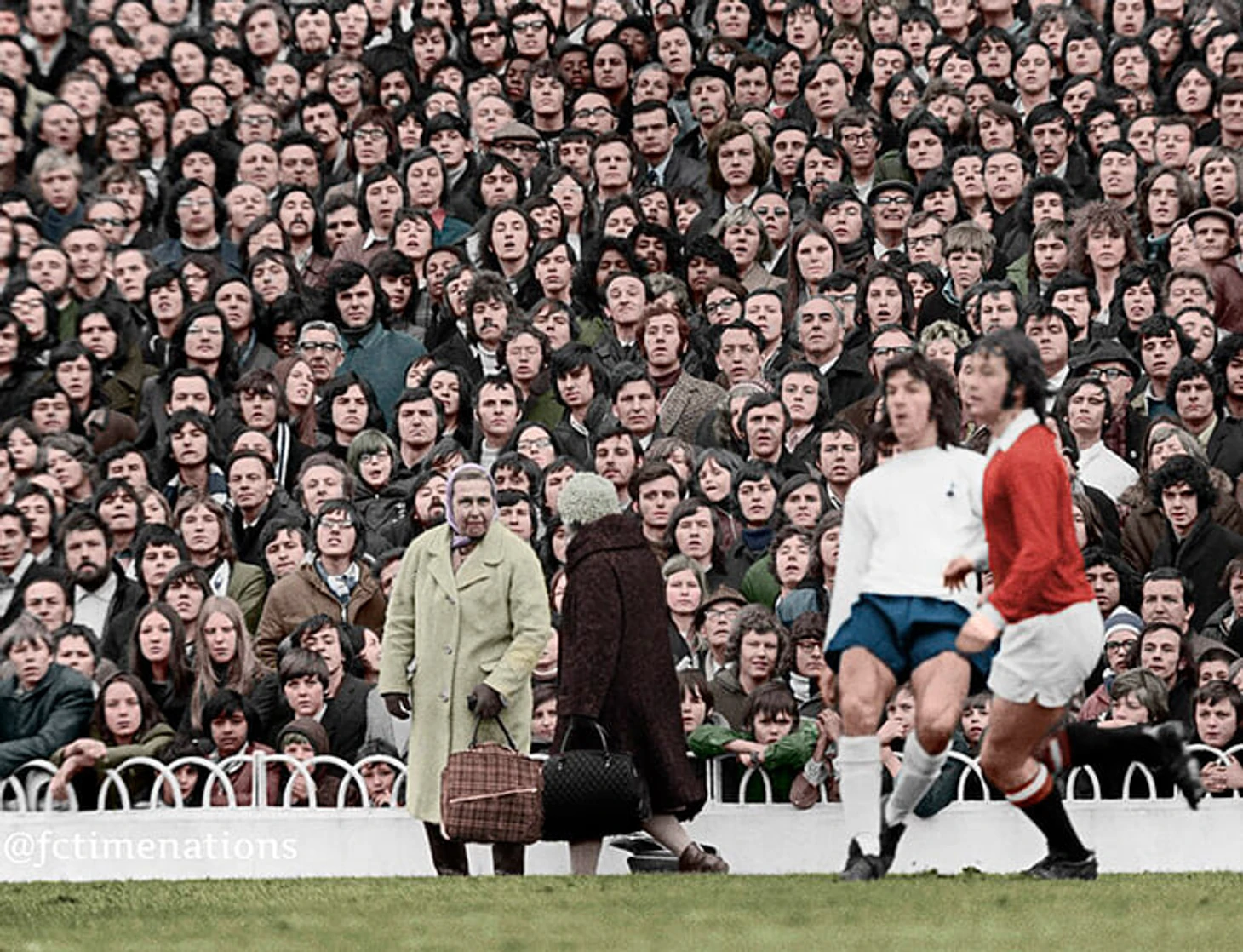 1972. Бабушки во время игры «Тоттенхэма» и «Манчестер Юнайтед». Версию снимка от британского колоризатора вы можете увидеть в материале Егора Мичурина.