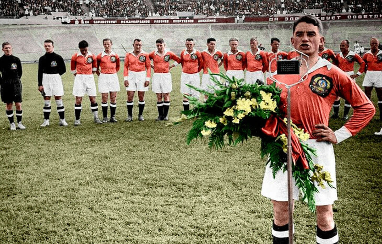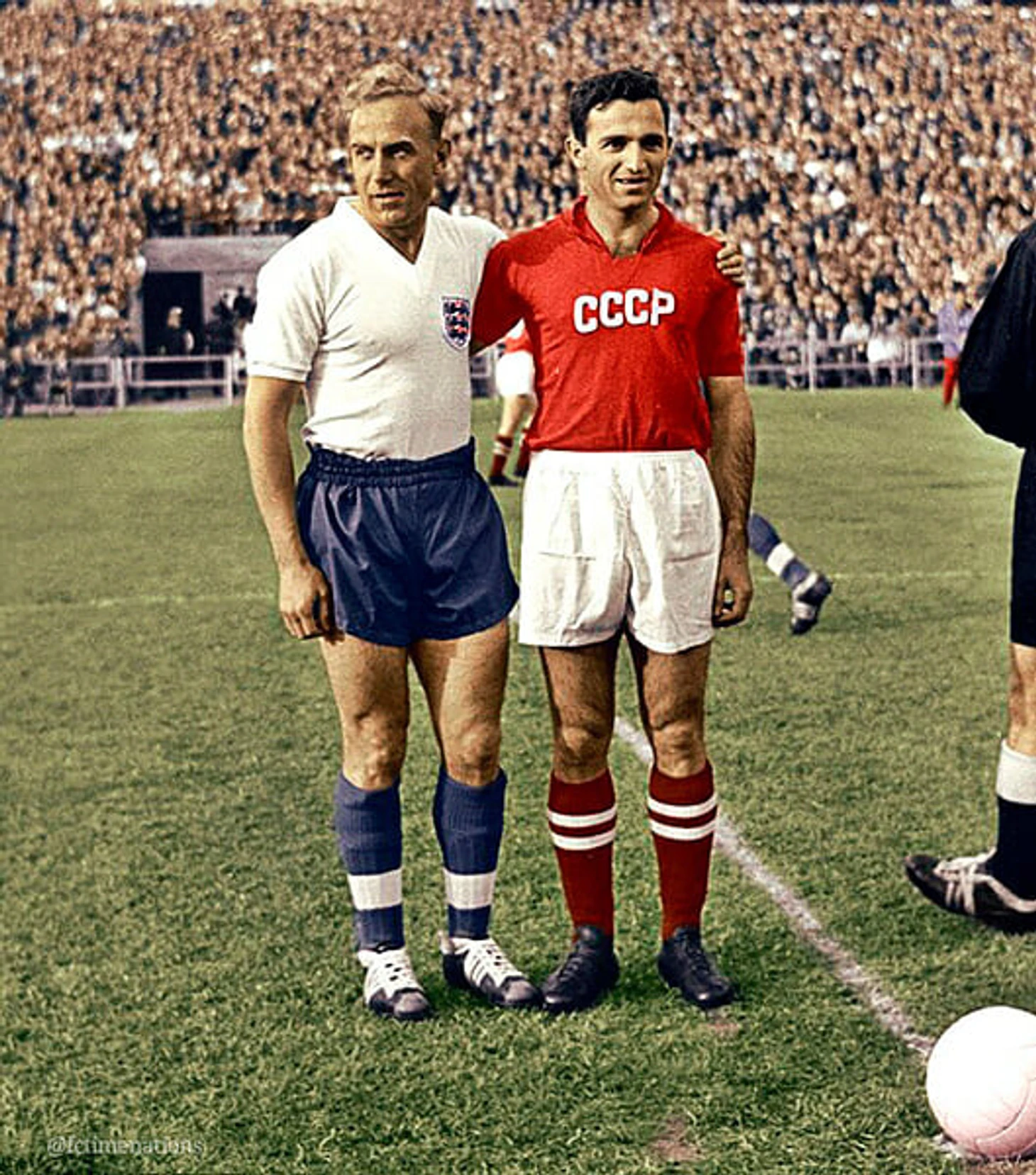 1958. Билли Райт и Никита Симонян перед дополнительным матчем за выход в 1/4 чемпионата мира. Сборная СССР победила 1:0.