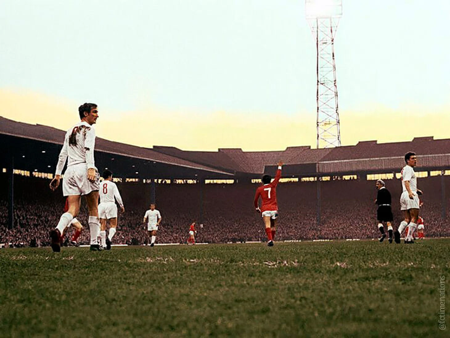 1968. Джордж Бест празднует гол «Реалу» в полуфинале Кубка чемпионов.