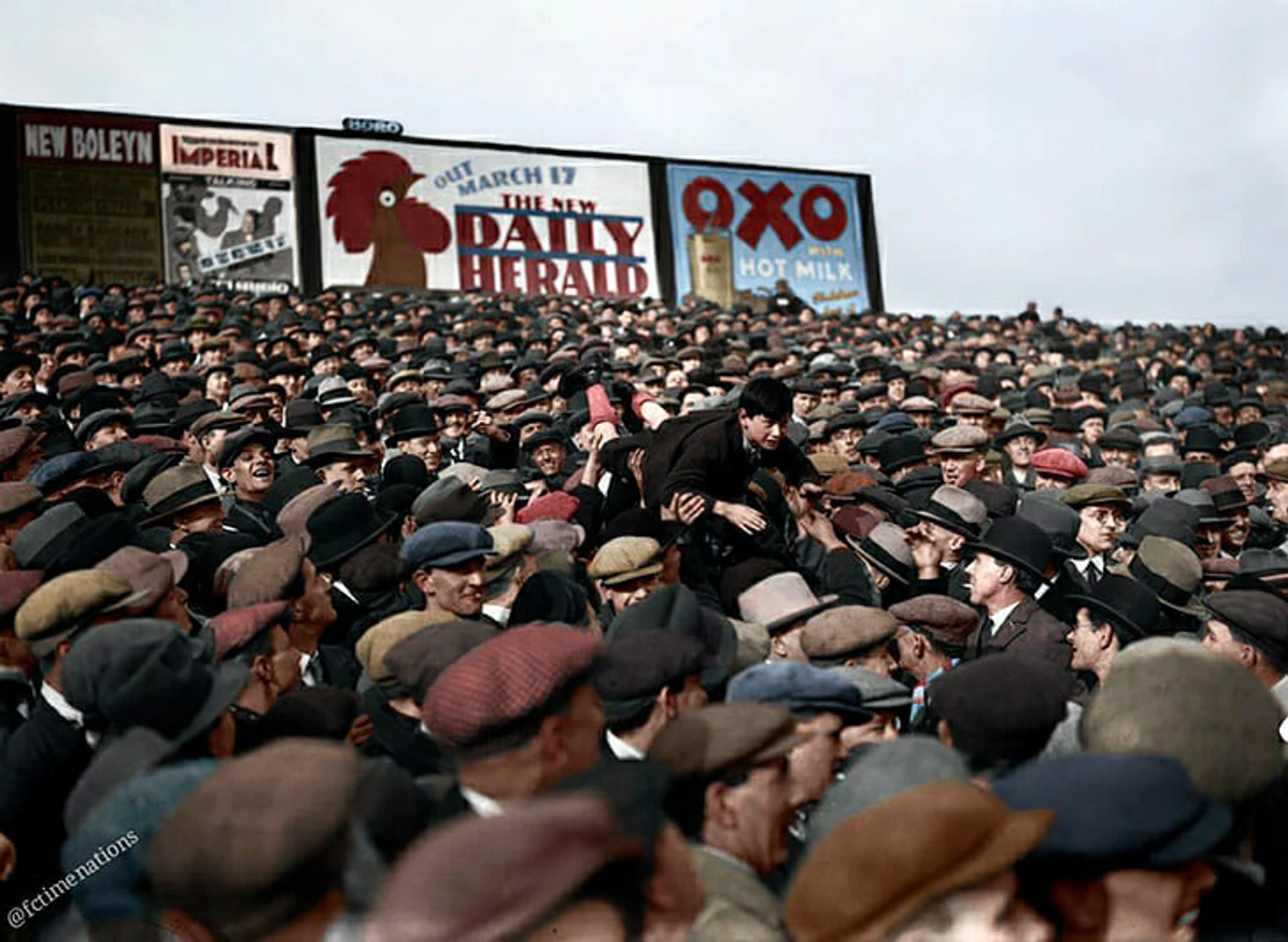 1930. Зрители «Болейн Граунд» (все в шляпах!) переносят мальчика поближе к полю.