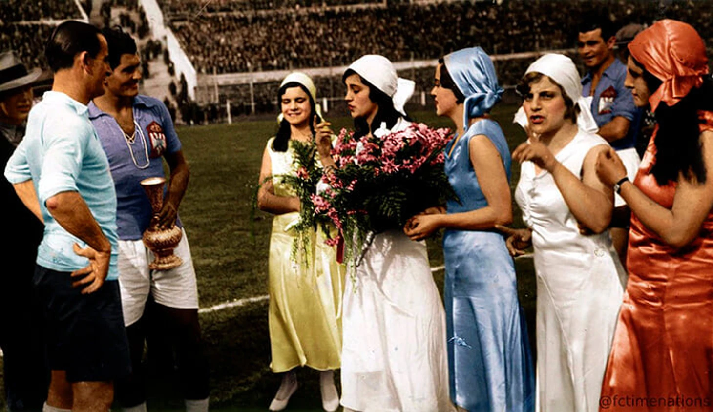 1930. Яркие девушки с букетом перед полуфиналом ЧМ-1930 Югославия – Уругвай.