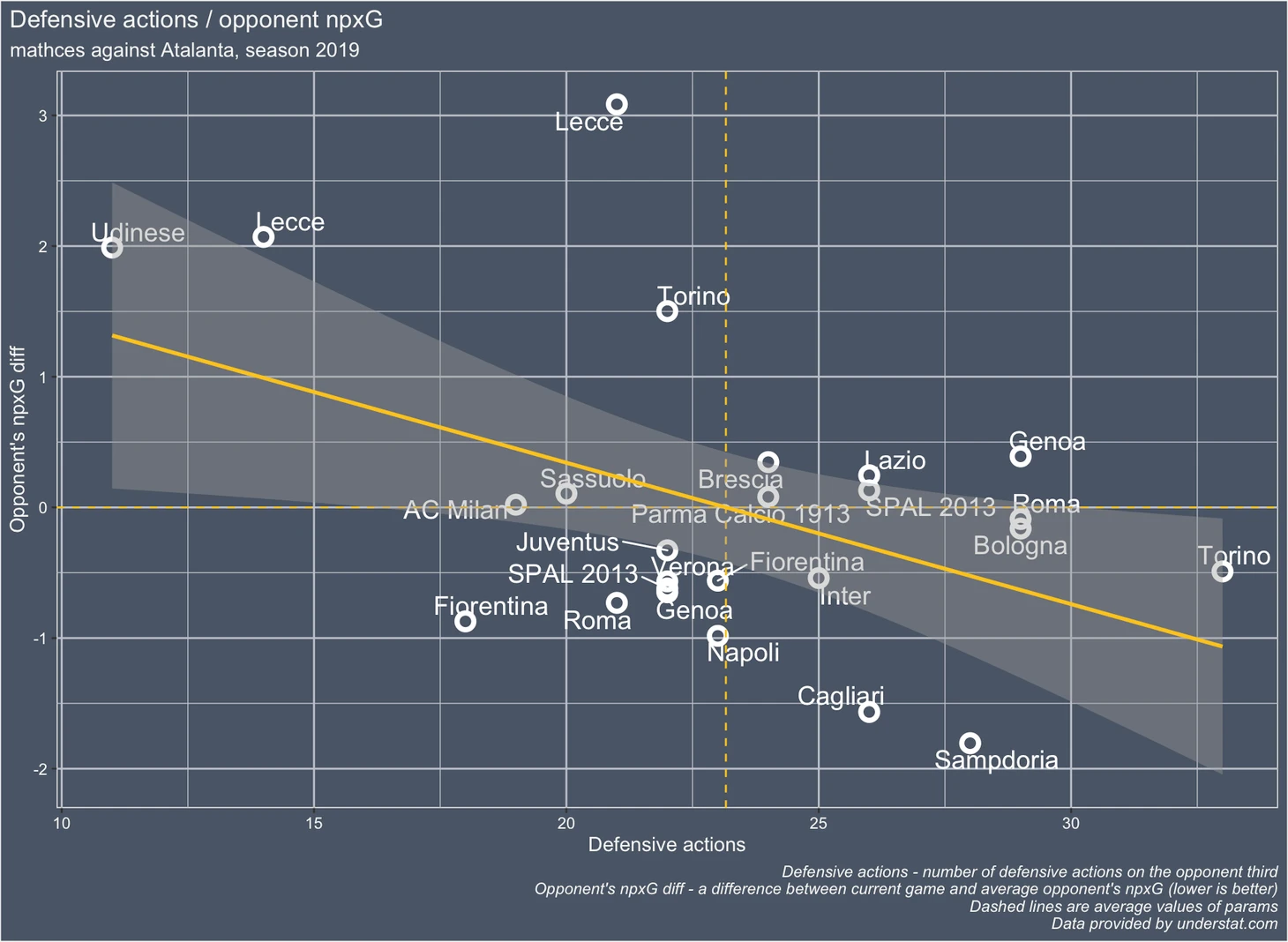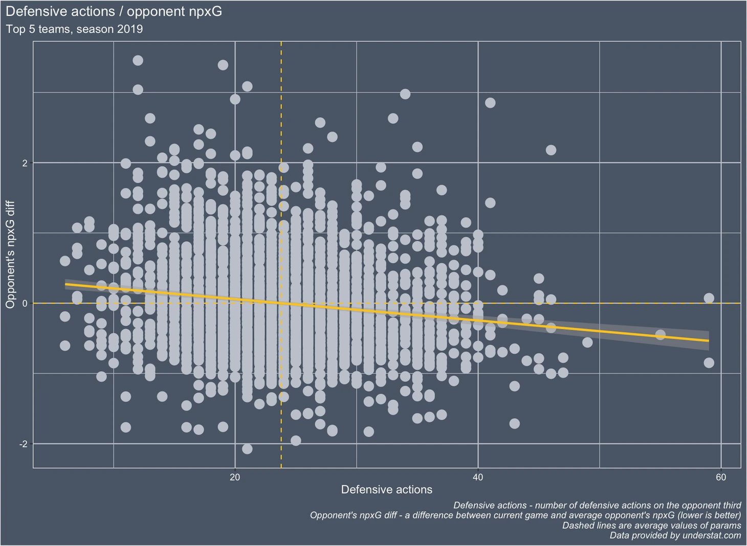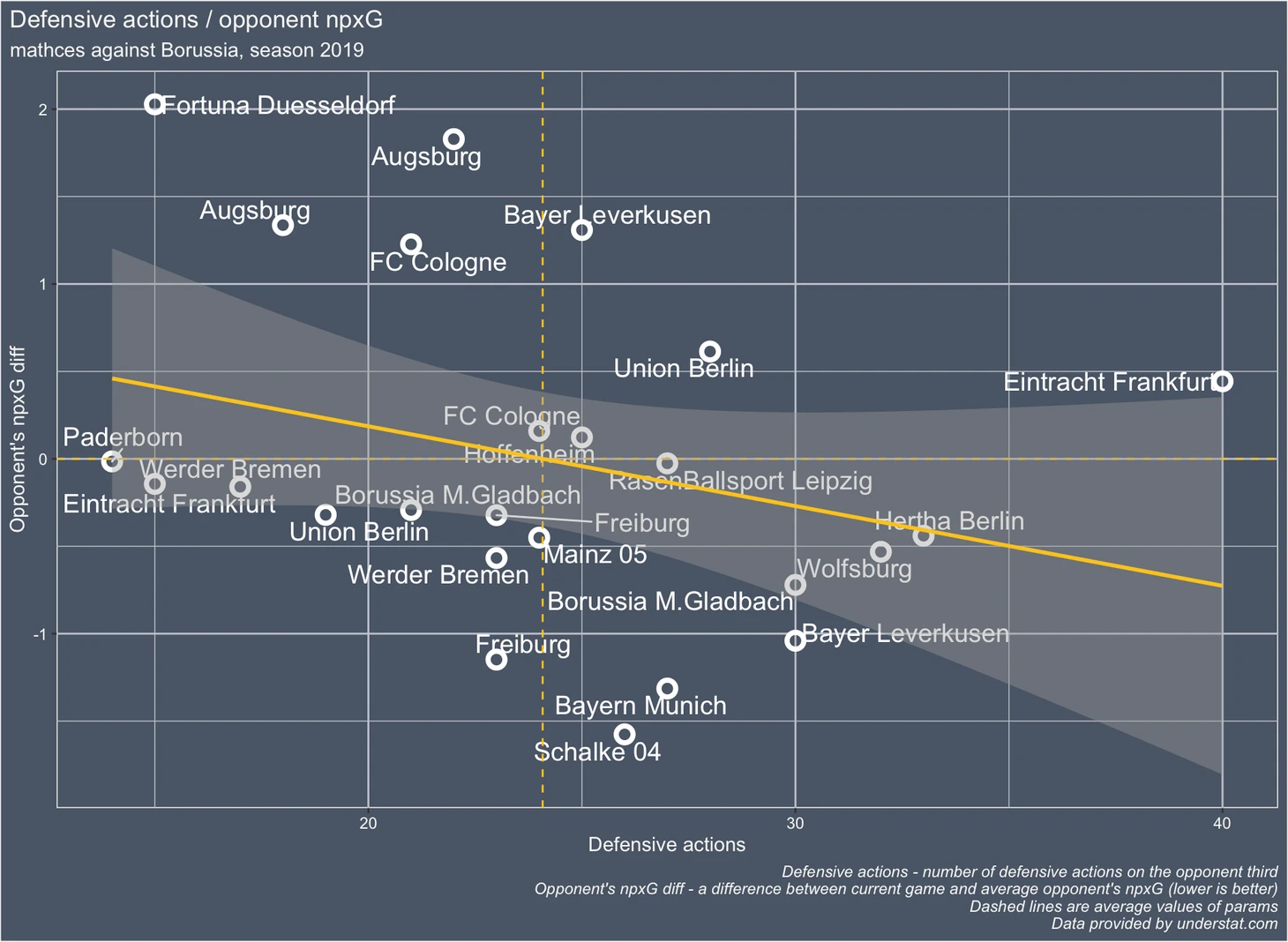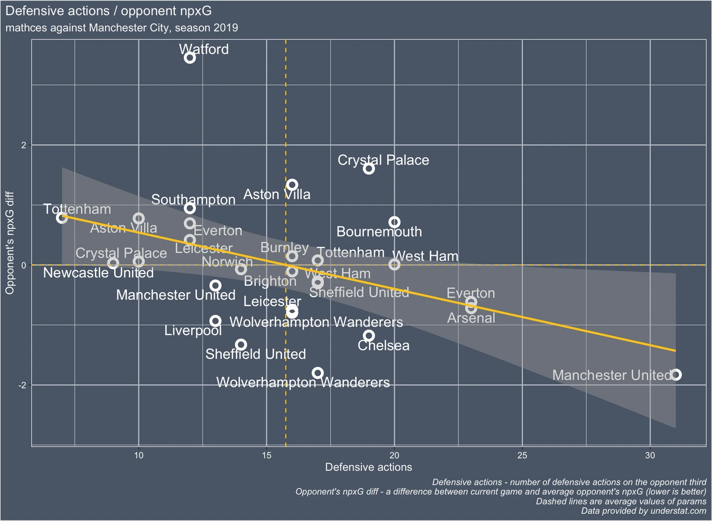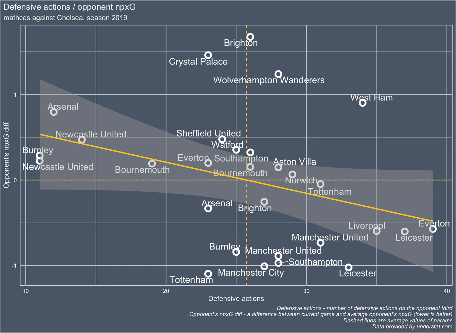ось Y - разница между средним показателем npxG Ливерпуля по сезону и npxG в данном конкретном матче. Чем лучше команде удалось сдержать Ливерпуль в этом сезоне тем ниже она расположена по оси Y